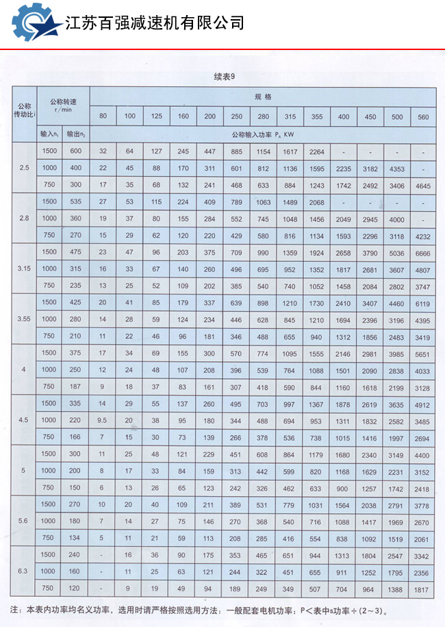 平行軸系列齒輪箱的公稱輸入功率P。(表9—20)按載荷平穩,每天工作時間小于或等于10h,每小時啟動不超過5次.允許啟動轉矩為工作轉矩的2倍。單向運轉,單對齒輪的接觸強度安全系數約為1,失效概率小于或等于1%等條件計算確定的,,齒輪箱雙向運轉時.需視情況將PA乘上0.8—1.0的系數, 當反向載荷大,換向頻繁、選用的可靠度系數K。較低時.系數取較小值.反之取較大值,、