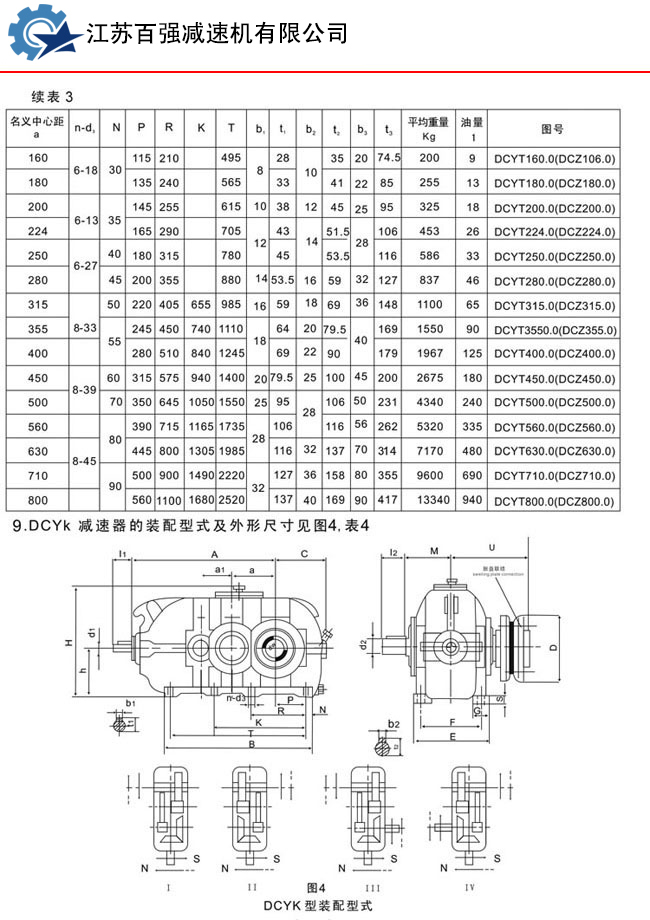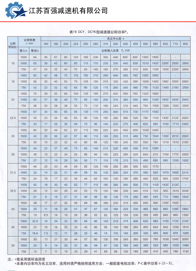 DCY、DCYK、DCZ型減速機(jī)各有15種規(guī)格,名義中心距為:160,180,200,224,250,280,315,355,400,450,500,560,630,710,800mm;每種規(guī)格均有11種傳動(dòng)比(16,18,20,22.4,25,28,31.5,35.5,40,45,50)兩種旋向,四種裝配型式,分別組成660種減速機(jī)。
